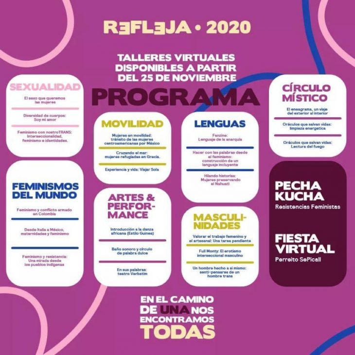 A partir de este 25 de noviembre, Día Internacional para la Eliminación de la Violencia en contra de las Mujeres, podrás disfrutar los 21 talleres virtuales, totalmente gratis, que Refleja Encuentro Feminista ofrecerá en línea; en los cuales tratarán temas como la sexualidad, la movilidad, las artes, los feminismos del mundo, el lenguaje, las masculinidades, y la espiritualidad.