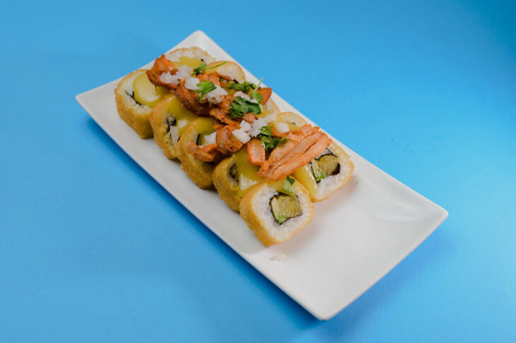 Para muestra, algunas de nuestras recomendaciones: el Chorizo Roll, un rollo relleno de arrachera, aguacate y chipotle gratinado con queso manchego y chorizo; el Guacamolito con arrachera, queso crema y chiles toreados, cubierto de guacamole artesanal; o el Sushi al pastor, relleno de aguacate, piña caramelizada y queso gouda gratinado y acompañado con carne al pastor, cebolla y cilantro. Estas combinaciones, si acaso impensables, exigen abandonar cualquier forma de purismo en la puerta y dejarse llevar por el sabor.