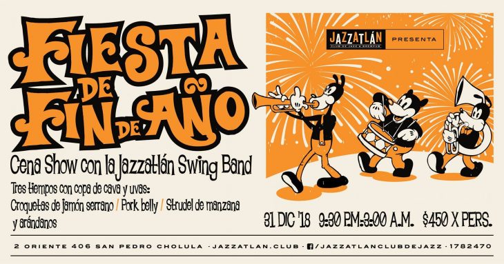 Recibe el 2019 con estilo. Inspirados en los clásicos festejos de los años ’20, Jazzatlán ha preparado para ti una cena y show con la Jazzatlan Swing Band, que interpretará la música de las grandes bandas de época. Además podrás disfrutar de una cena de 3 tiempos que incluye croquetas de jamón serrano, Pork Belly y strudel de manzana. Todo lo anterior por supuesto, acompañado de las tradicionales 12 uvas y una copa de vino para brindar.