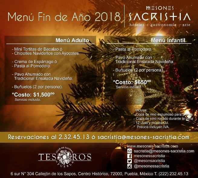 ¿Qué mejor forma de cerrar el año que en uno de los mejores restaurantes de cocina poblana en Puebla? Mesón Sacristía ofrece un menú de cuatro tiempos para despedir 2018 de la mejor forma. Y por supuesto, también han pensado en los más pequeños con un menú de tres tiempos. Ambos cuentan con dos opciones, perfectas para una cena de fin de año, todas con el toque de la gran chef Ruth Ruíz.