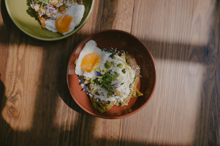 Unos Chilaquiles Suizos, con salsa cremosa de pimientos rostizados, huevo estrellado, crema entera, queso Cotija, y una base de lentejas que sustituye a los clásicos frijoles, un delicioso equilibrio entre lo nuevo y lo de toda la vida. Y apenas vamos empezando con este desfile de antojos. Otra de las joyas del menú de Musgo es su Cazuela Piñona, unos huevos en salsa de piñón y tomate, salteado con pimiento y cebolla, piñones tostados y una orden de  crostinis crujientes para limpiar la cazuela.