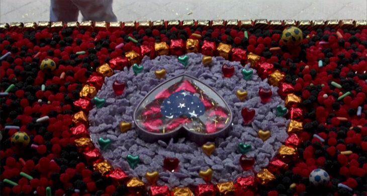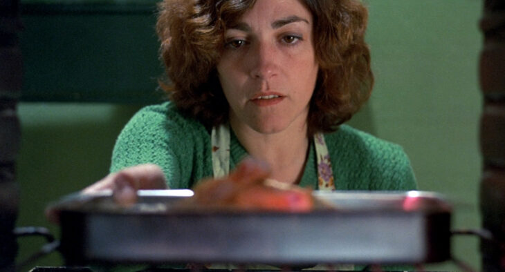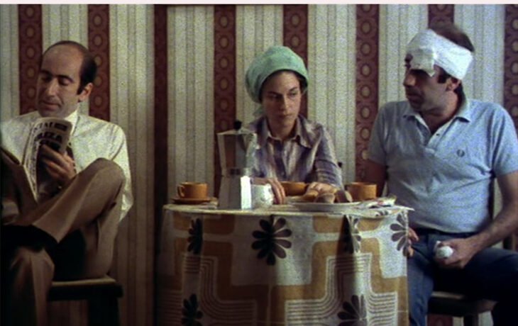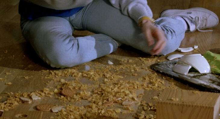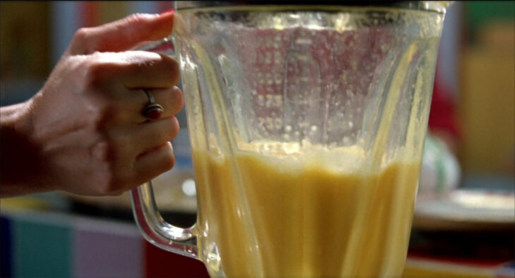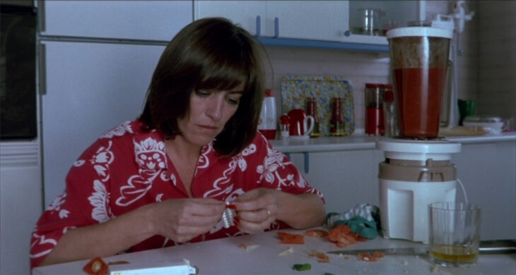 Pero así como el desayuno (y en general la comida) es una muestra de afecto, en el cine de Almodóvar también hay comidas que sirven para mostrar la opresión de lo cotidiano. Tal es el caso de Luci cuando la vemos por primera vez en Pepi, Luci, Bom y otras chicas del montón, flanqueada por su marido abusador y el gemelo de éste. En esta escena, Almodóvar recurre al color y a la comida para mostrarnos el estado en el que se encuentra su personaje titular: el beige de unas madalenas probablemente insípidas se mezcla con unas tazas, mantel y papel tapiz del mismo color para reflejar la existencia aburrida de Luci. Un mundo plano comparado con la explosión de color y fiesta que vivirá después con Pepi y Bom.
