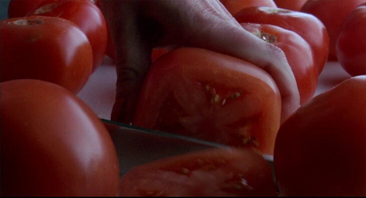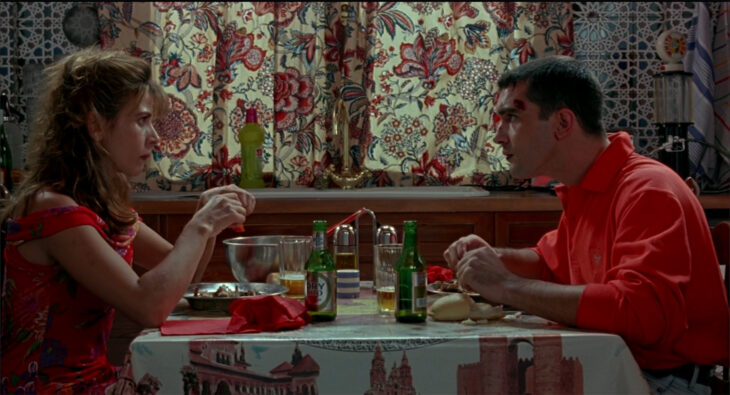 Este breve momento de ¡Átame! (1989) describe a la perfección una de las principales funciones de la comida en el cine de Almodóvar: es ante todo hogar, pero también, es una de las formas más auténticas y honestas de expresar afecto. El personaje que interpreta Victoria Abril, secuestrada por Antonio Banderas, no sabe si volverá a su hogar, un espacio más mental que físico y al que el tradicional Pisto Manchego la devuelve de inmediato.