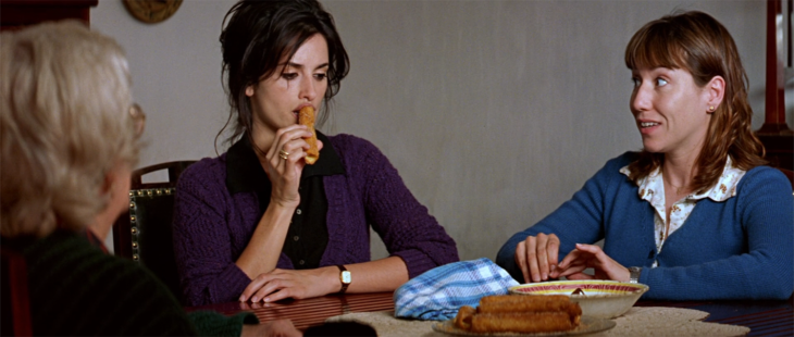 Pero es en Volver donde la comida juega acaso el papel más central. Desde las primeras secuencias, aparece en los mismos tuppers de La flor de mi secreto (curiosamente, entregados también por Chus Lampreave, quien Almodóvar calificó como “la mejor en interpretar los papeles inspirados por mi madre”), como pistas del pasado de las protagonistas, pero también del misterio central. La comida acabará también por salvar a la Raimunda de Penélope Cruz, quien en su momento de mayor crisis, toma el restaurante que uno de sus vecinos le ha encargado y a fuerza de cocinar, trae de vuelta vida no sólo a su barrio, sino a ella misma. Y estará presente en la culminación, con el ya mencionado flan. En Volver, la comida es ese talismán al que Agustín Almodóvar hace referencia: esos trozos de suerte que salvan a las protagonistas, y por lo tanto, al espectador.