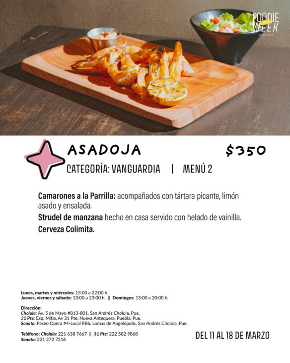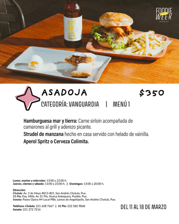 Ya sea en la 31 ponientes, en las calles de Puebla, o en San Andrés Cholula, en cualquiera de las sucursales de Asadoja hallarás pura maravilla proveniente del grill. Aquí las cosas se hacen con pasión y a fuego lento como el T-Bone, el Rib eye o hasta sus hamburguesas. Además de la comida, los espacios de Asadoja son cálidos, justo como su cocina y su atención.