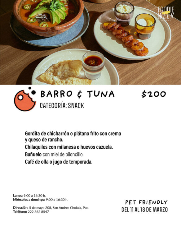 Pura sabrosura. El año pasado Aye Aye se convirtió en Barro Y Tuna, un restaurante relajado en donde la cocina es como debe ser: vasta, sabrosa y reconfortante. Este espacio en la 5 de mayo, en San Andrés Cholula, busca consentir a sus comensales desde las primeras horas de la mañana hasta entrando la tarde. Unas gorditas de chicharrón o una torta ahogada de carnitas para crudear; un sándwich de huevito o uno de tocino con queso y cebolla caramelizada para empezar el día con el pie derecho. En Barro y Tuna se apapacha a los hambrientxs, crudxs y antojadizxs.