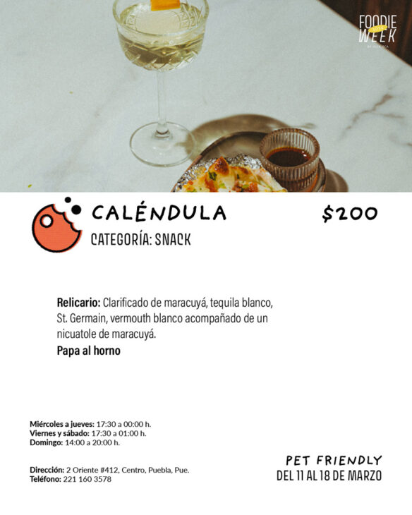 Sobre la 2 oriente y a unos pasos de El Parián, Caléndula es el plan perfecto para visitar, una tarde cualquiera, las calles del Centro de Puebla. Ya sea un Clamato (que aquí son obras maestras), un pulque o cualquiera de sus cócteles como el Brazica con concentrado de kale con pepino y mezcal; o un Pink Bitter con Campari, jugo de piña, limón eureka y clara de huevo, aquí siempre encontrarás el trago que tu antojo necesita.
