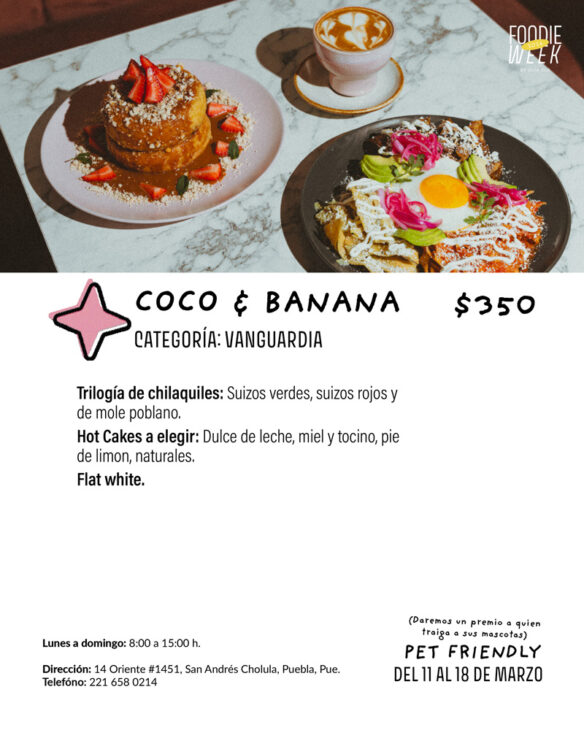¿Por qué desayunar ligero cuando existe Coco & Banana? Sobre la 14 oriente, en San Andrés Cholula, está Coco & Banana, un resturante dedicado al primer bocado del día y expertos en Hot Cakes, que aquí son un sueño hecho realidad y hay para escoger: el Coco & Banana con Nutella, plátano, fresa y helado; el de Pie de Limón con crema de limón, frutos rojos y Oreo; o el de Dulce de leche, con mazapán, dulce de leche y fresa, entre otros.
