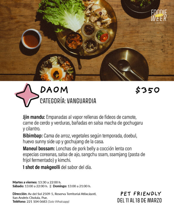 Daom es uno de esos lugares que te vuela la cabeza con su cocina, la cual mezcla lo tradicional con lo contemporáneo, dando como resultado obras maestras de la cocina coreana. Si bien sus guisos, complementos, ensaladas y sopas son una delicia, su fuerte es la Korean Pork BBQ, por lo que podrás disfrutar su Samgyeopsal (pork belly) grueso y delgado, su Yangniom moksal (cabeza de lomo marinado en salsa de soya dulce); o una hangjungsal bien doradita. Una gozada.
