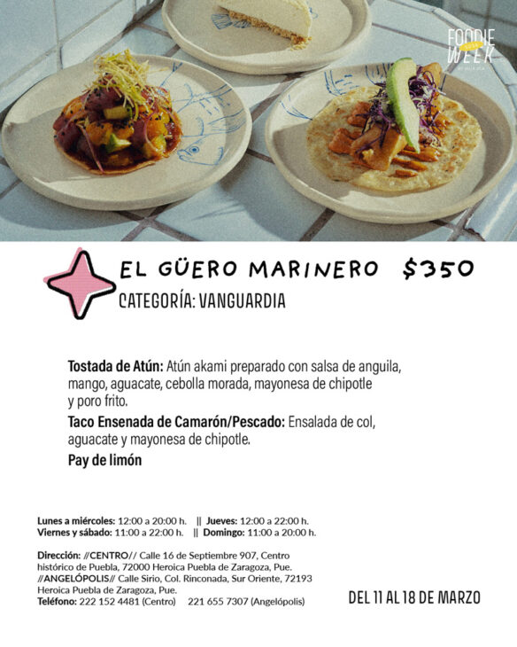 En el centro la vida es más sabrosa. Tan solo hace unos cuantos meses el Güero Marinero llegó al Centro de Puebla para mostrarnos a lo que sabría esta zona de la ciudad si tuviera playa. El amor por los mariscos en esta pequeña barra además de ser genuino en todos los sentidos comprende que los platillos simples en las manos correctas pueden convertirse en manjares y hacernos pasar los ratos más especiales. Aquí encontrarás desde una clásica Leche de Tigre con pescado fresco del día y plátanos fritos, hasta unas irresistible tostadas de atún y para algo más llenador te recomendaos sus Costras de camarón que son una locura.