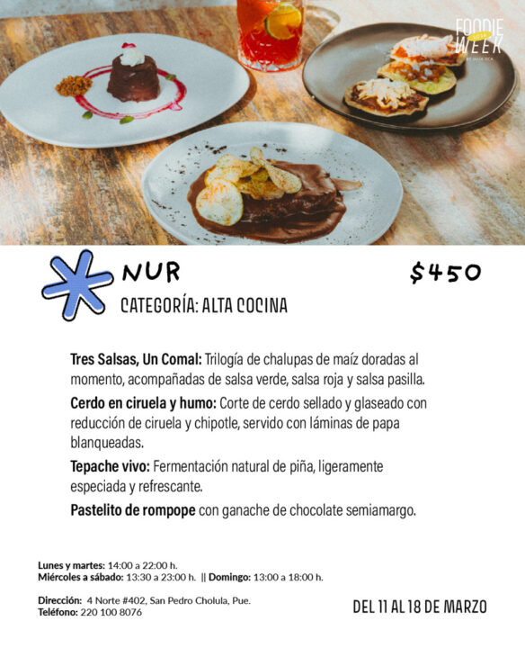 Si algo está haciendo ruido en Cholula es Nur. Este espacio abrió apenas su puertas en noviembre y gracias a su fusión de gastronomía mediterránea y mexicana, así como su increíble patio central, lo han convertido en uno de los lugares que más está llamando la atención en este 2026. Hemos recomendado ya su sopa de ajo, pero sus costillas en flor de jamaica son sin duda una de sus cartas fuertes.