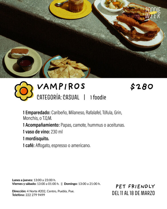 Los Vampiros Emparedados tienen un menú corto pero delicioso conformado por 3 sándwiches cubanos, curiosamente en su mayoría vegetarianos: el Caribeño con cerdo al mojo horneado y otro sinfín de ingredientes; el Tófula de tofu frito; y el Rafalafel. Un concepto sencillo dueño de un gran sabor. A veces menos es más y esta muy nueva dark kitchen vino a recordárnoslo.