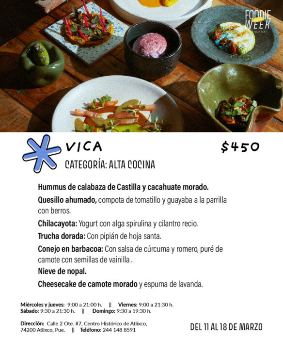 Guiados este año por las estaciones, VICA crea platillos a partir de 2 puntos: entender y comprender al ingrediente y crearle un plano cartesiano del sabor (si es dulce o salado; que se crea un platillo redondo y con puntos disruptivos). Es así como en este proyecto en el corazón de Atlixco hallarás experiencias culinarias únicas, acompañadas de cócteles igual de complejos y pensados.
